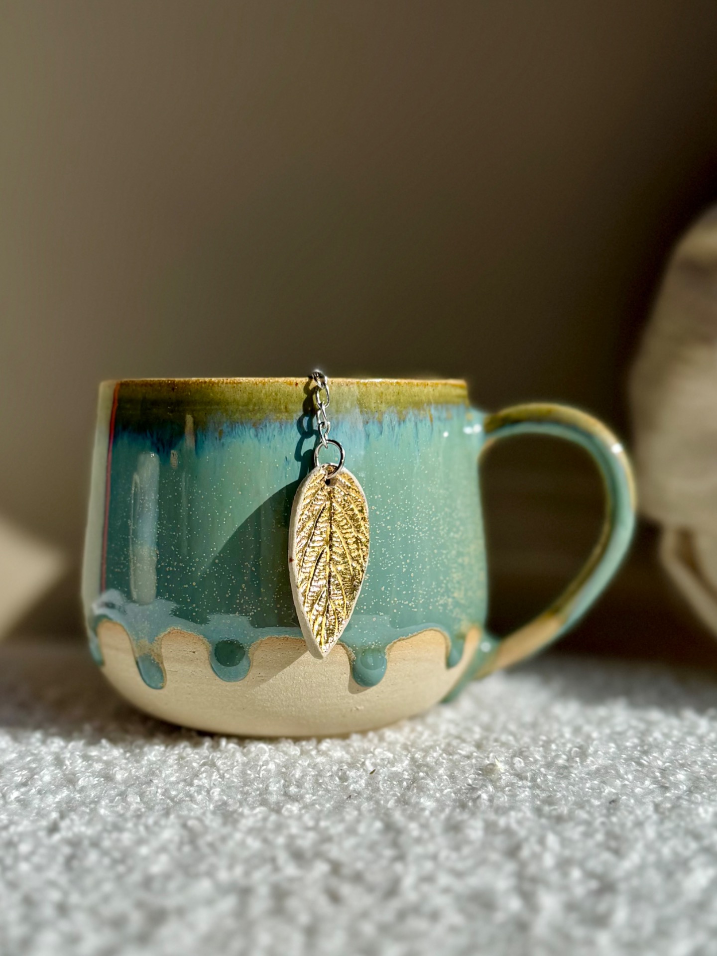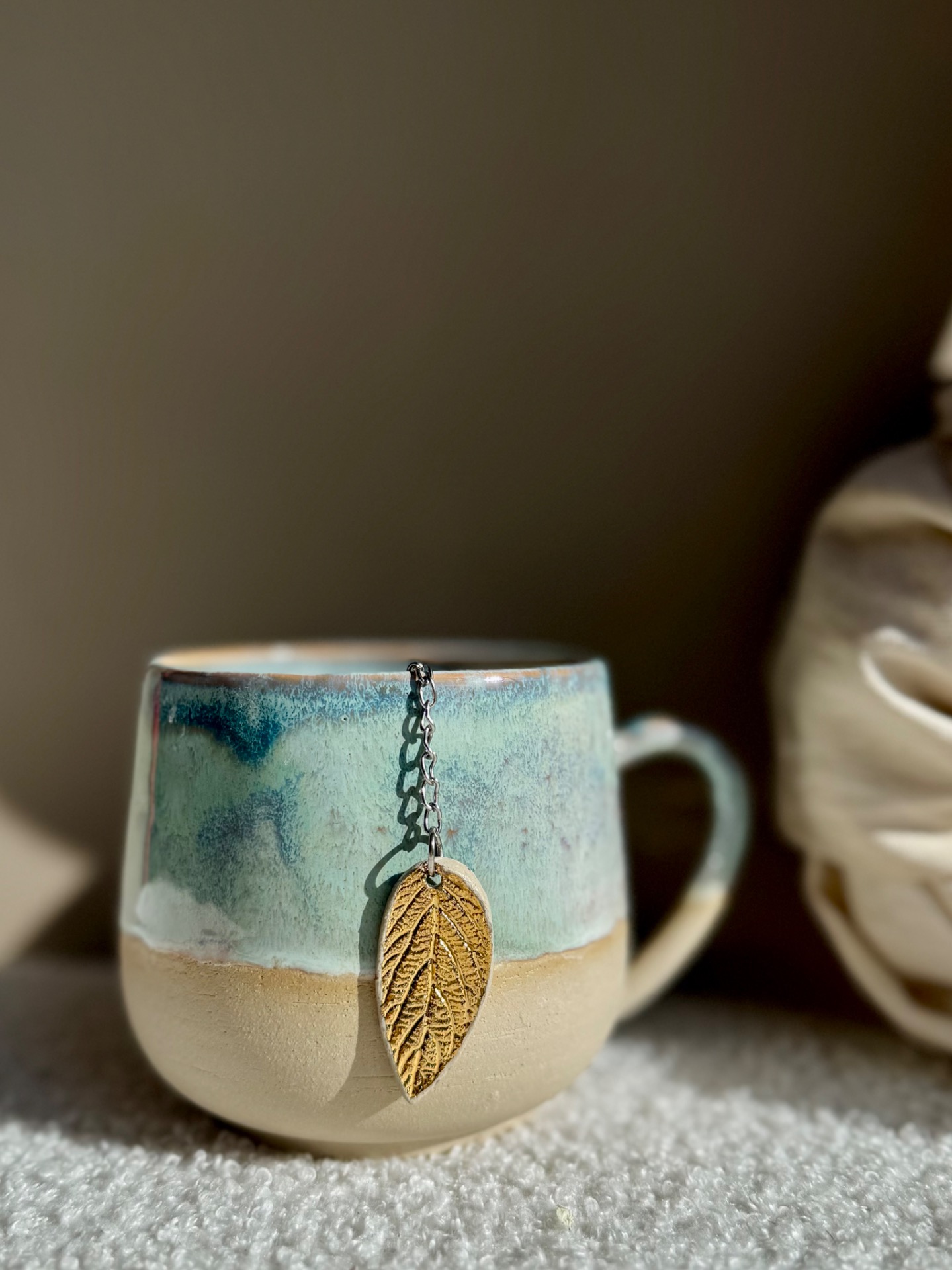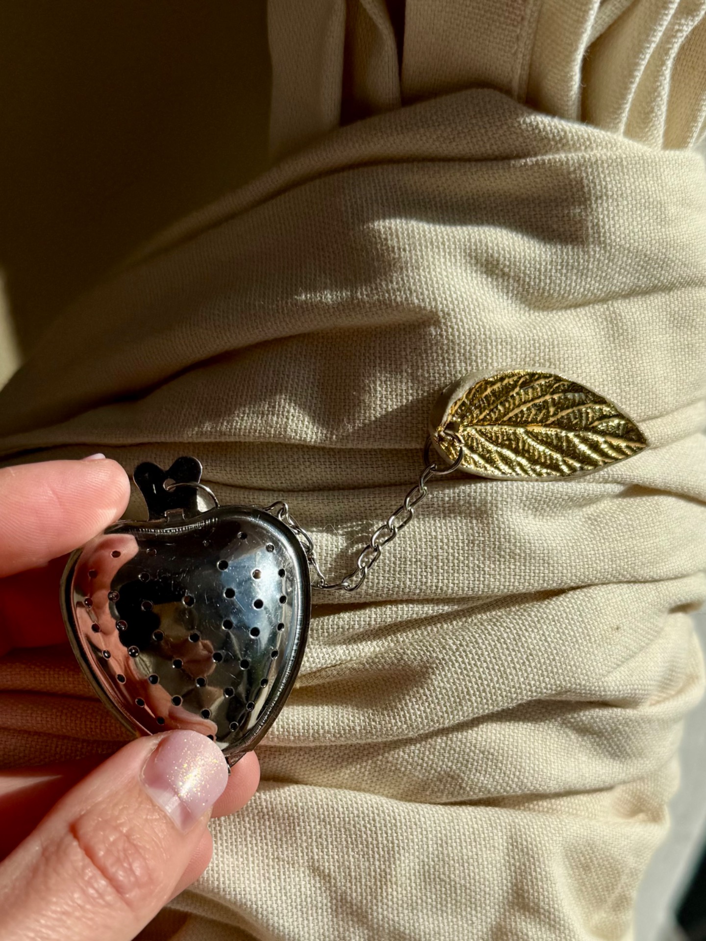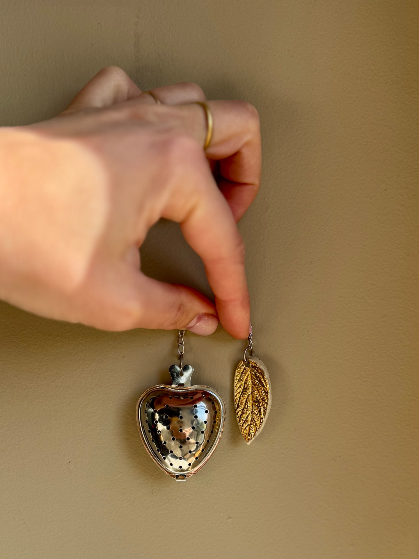Bijou de tasse, boule a the en forme de coeur.Pendentif feuille en or.