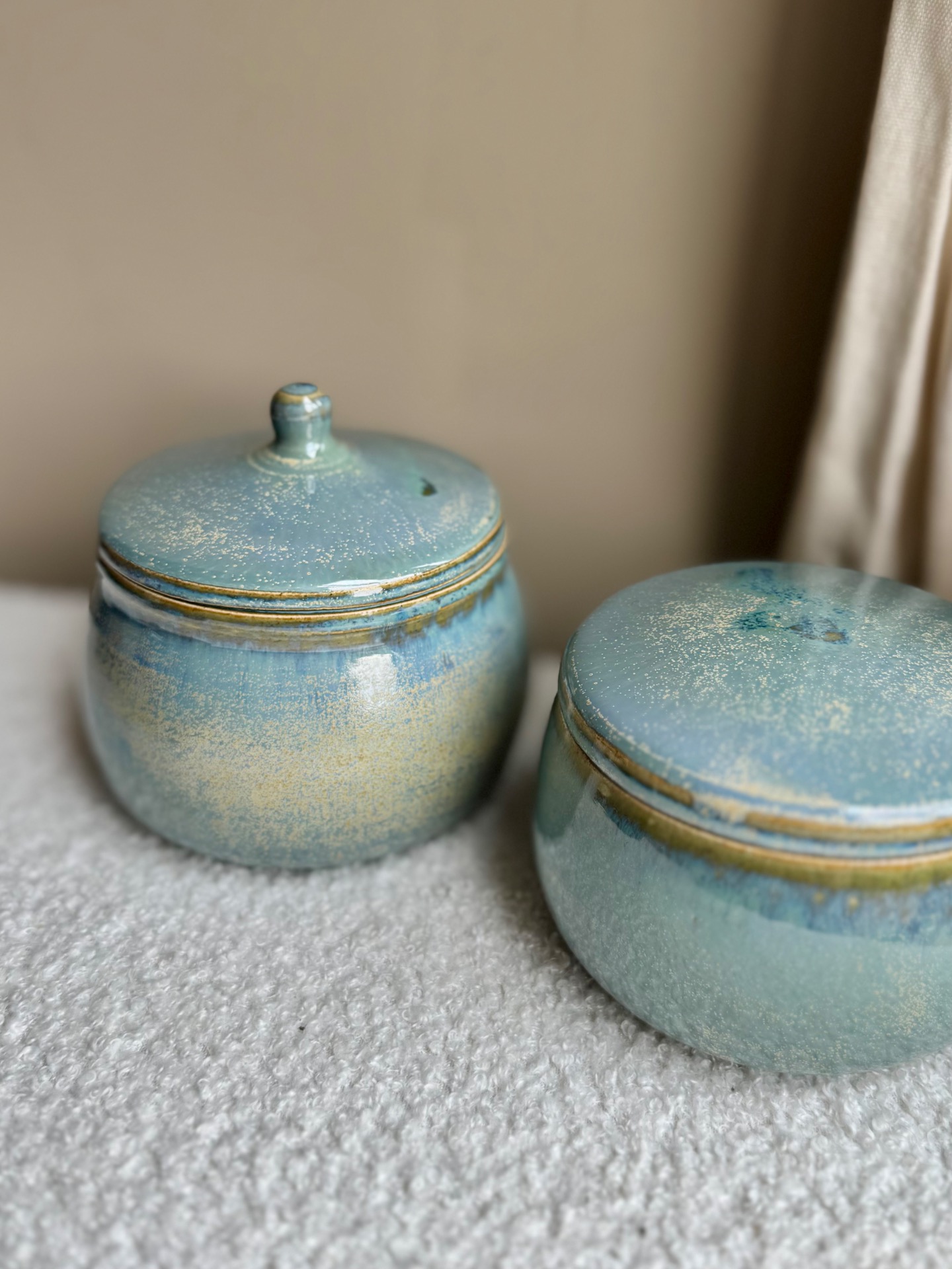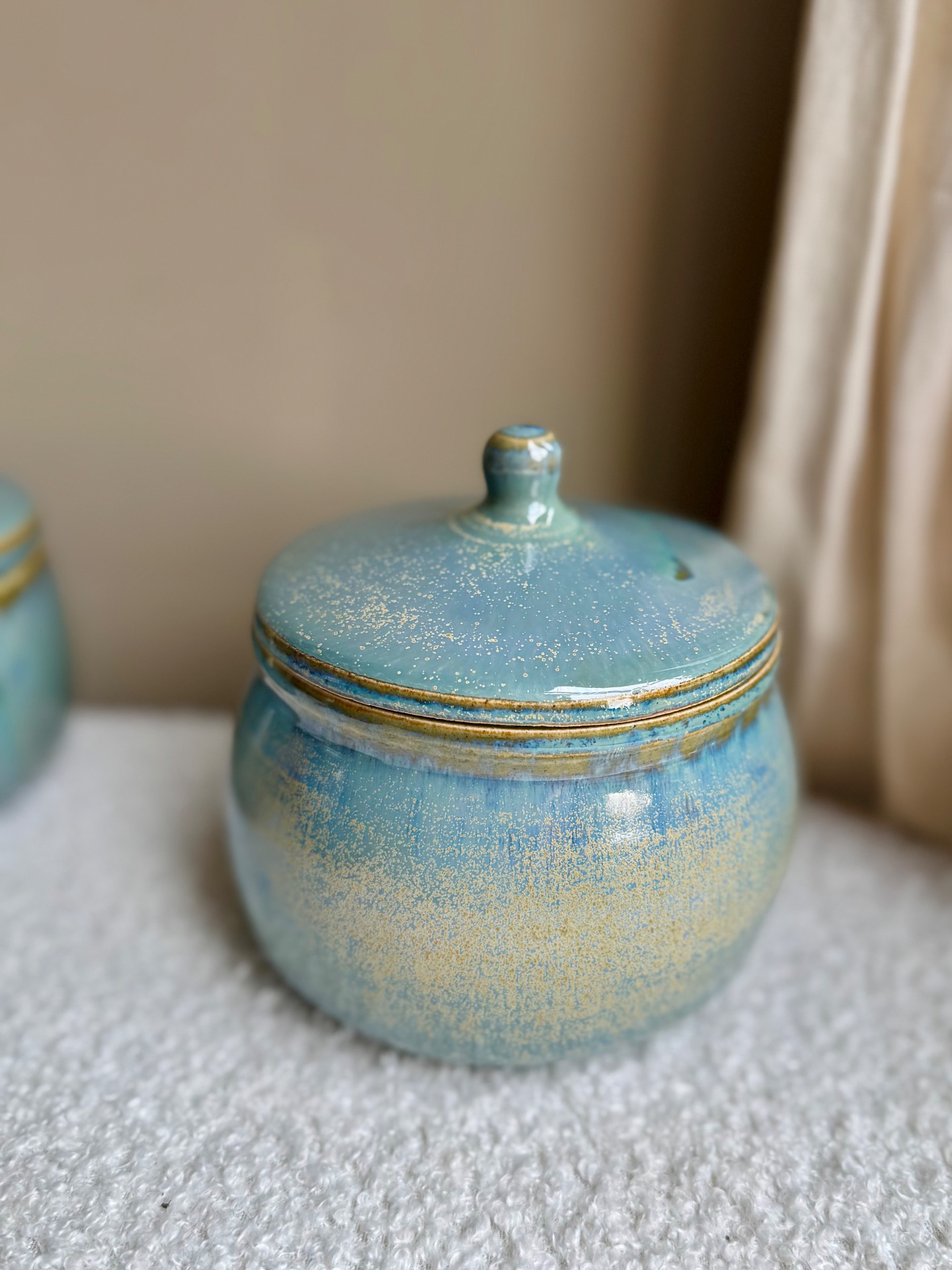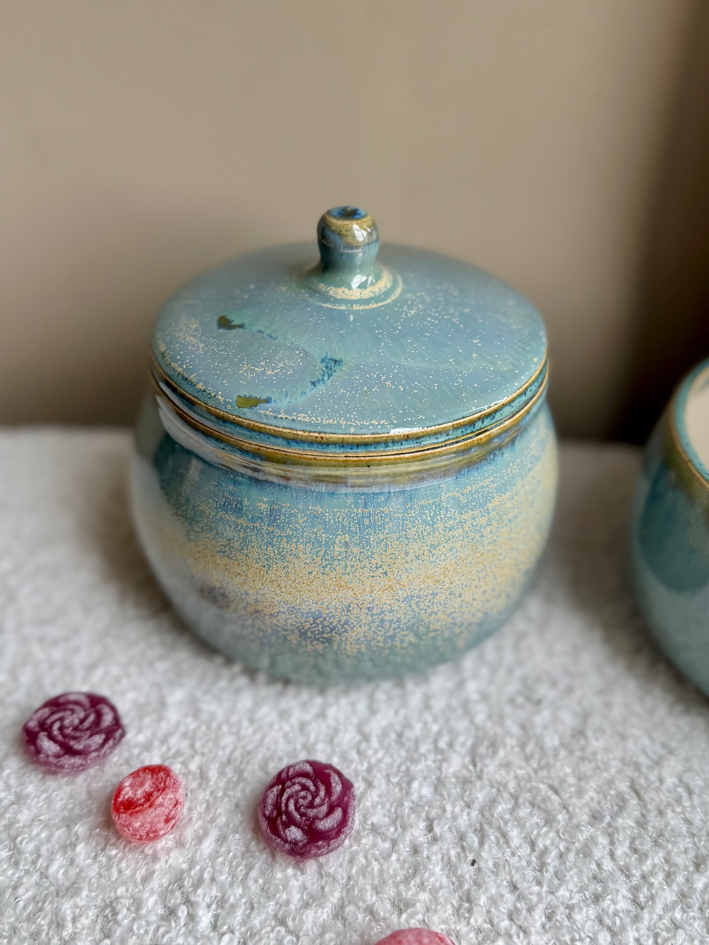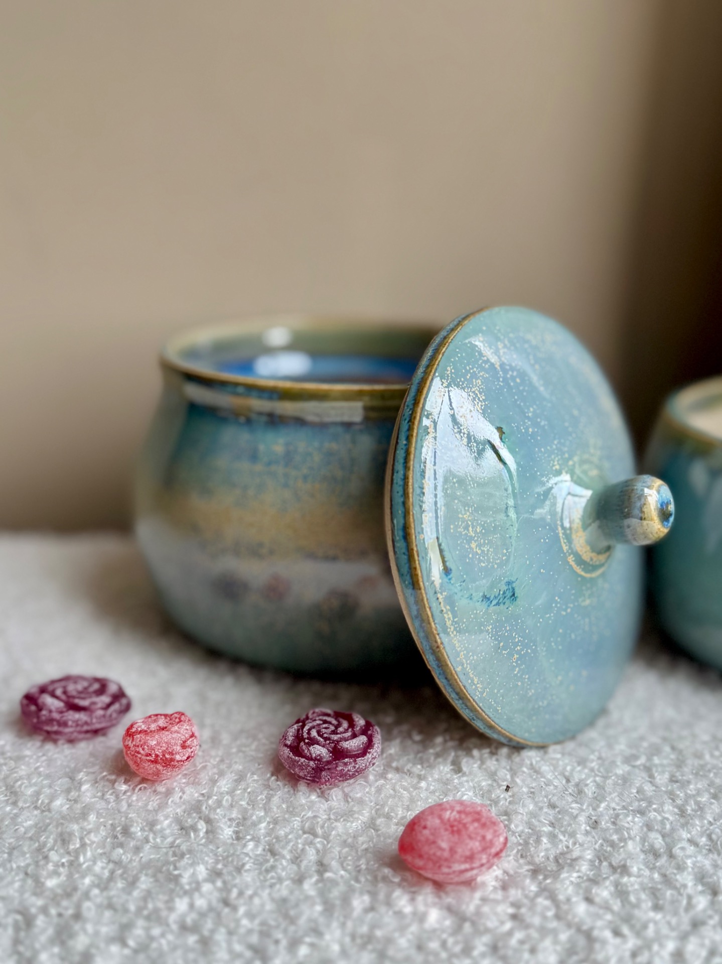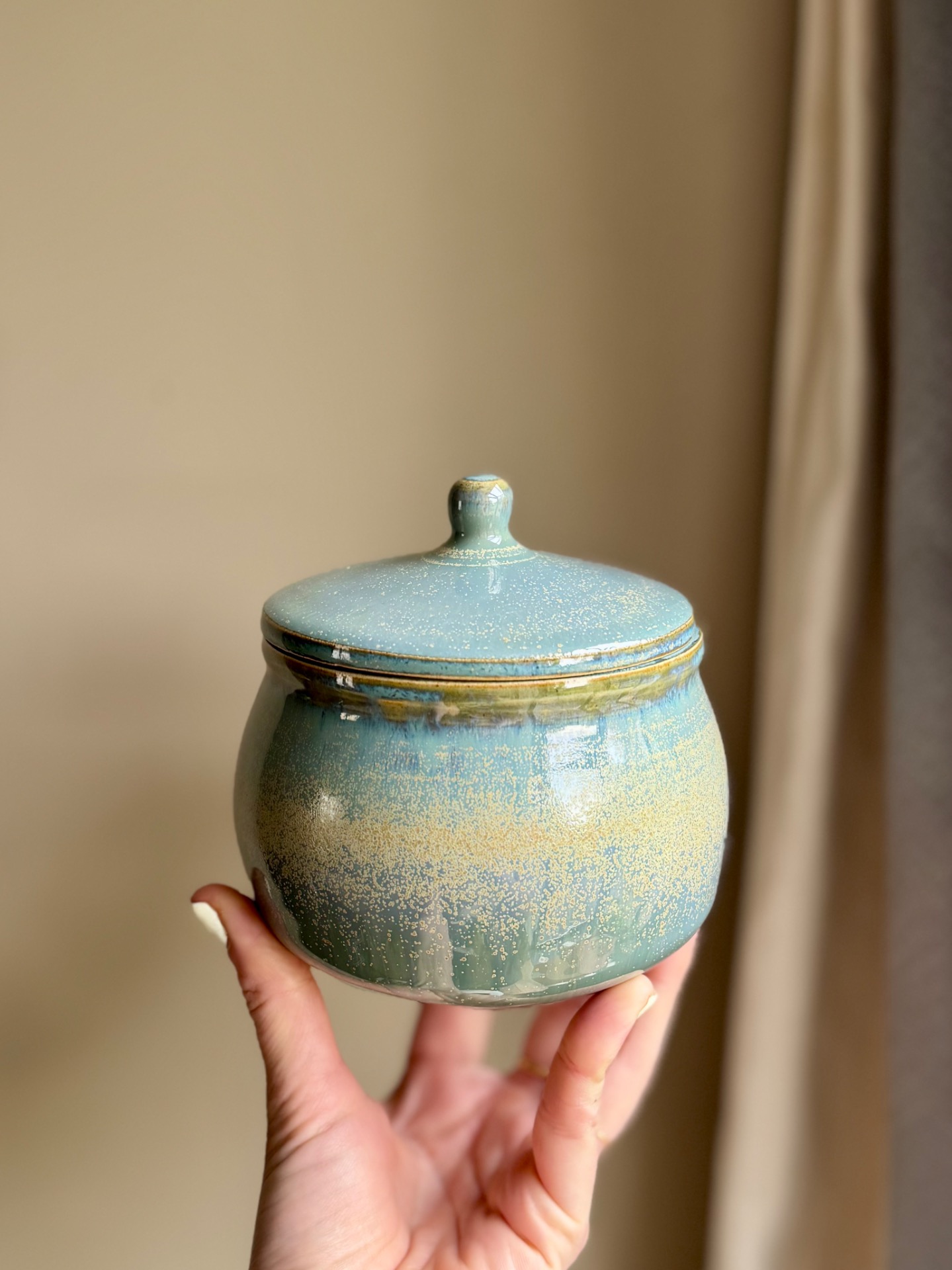 Bonbonnière bleue verte.Dimension : +/- 15/15cm.
