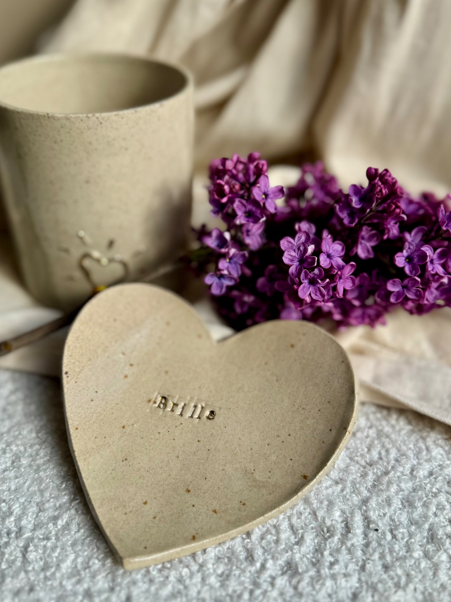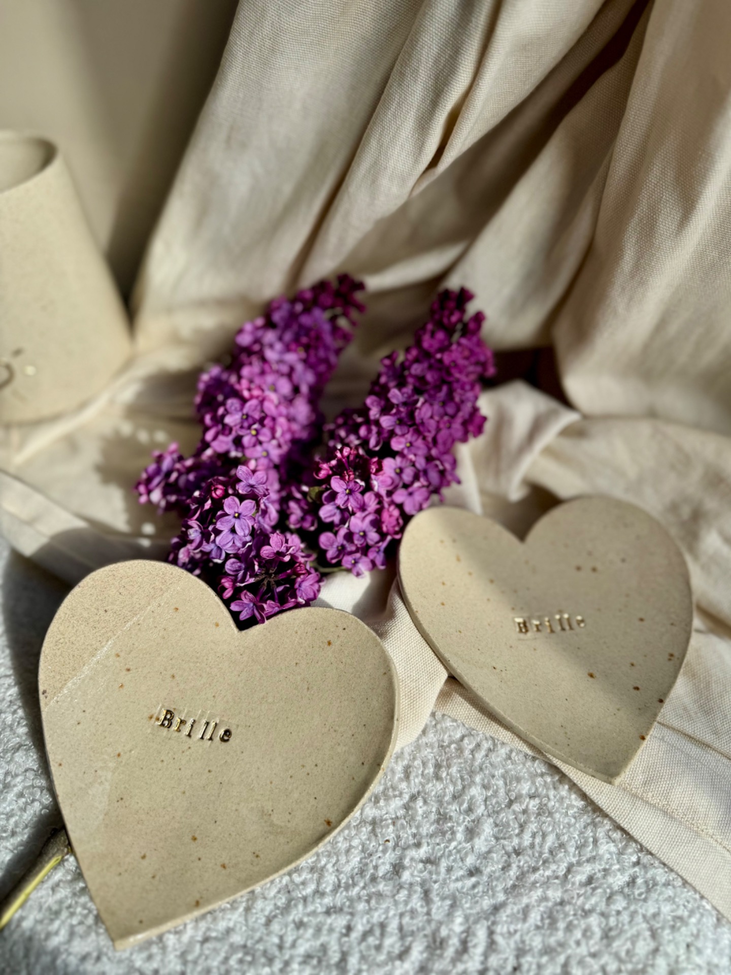 Coupelle en forme de coeur. Emaillage transparent avec inscription « Brille » en or.