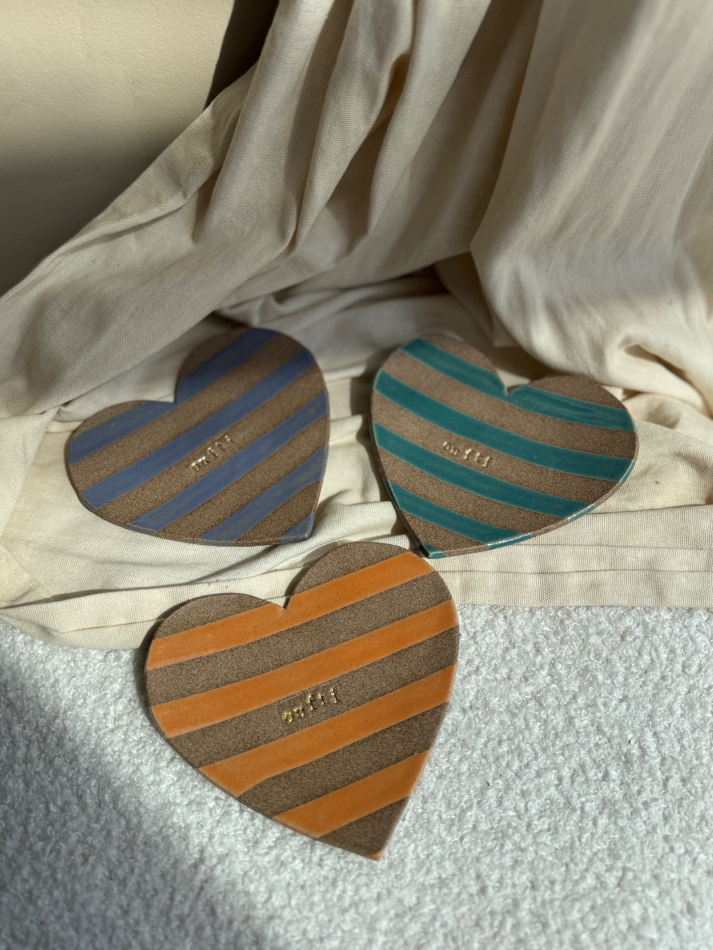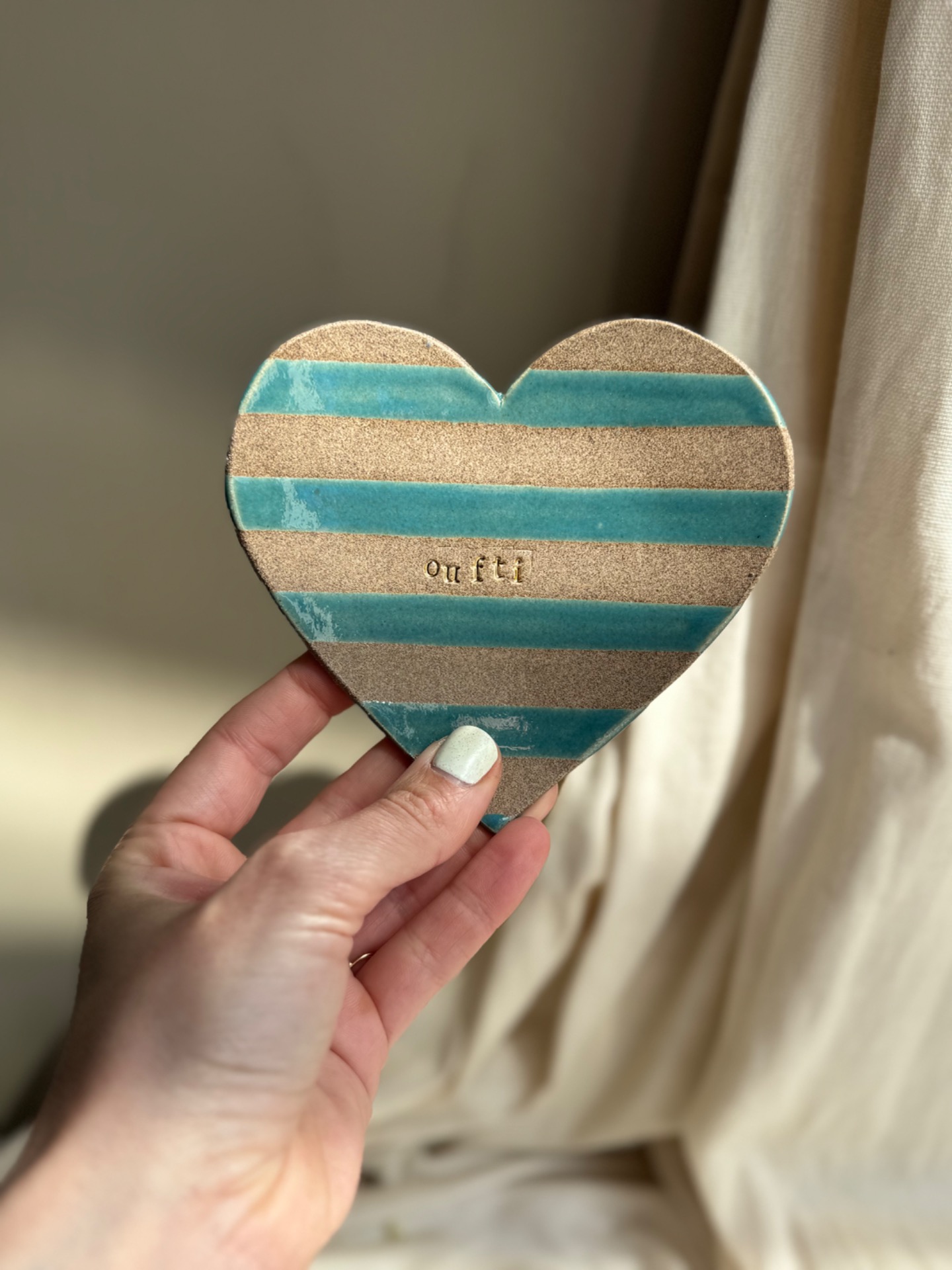 Coupelle en forme de coeur +/-12 cm de diamètre.Lignes turquoises, terre brune m, oufti or.