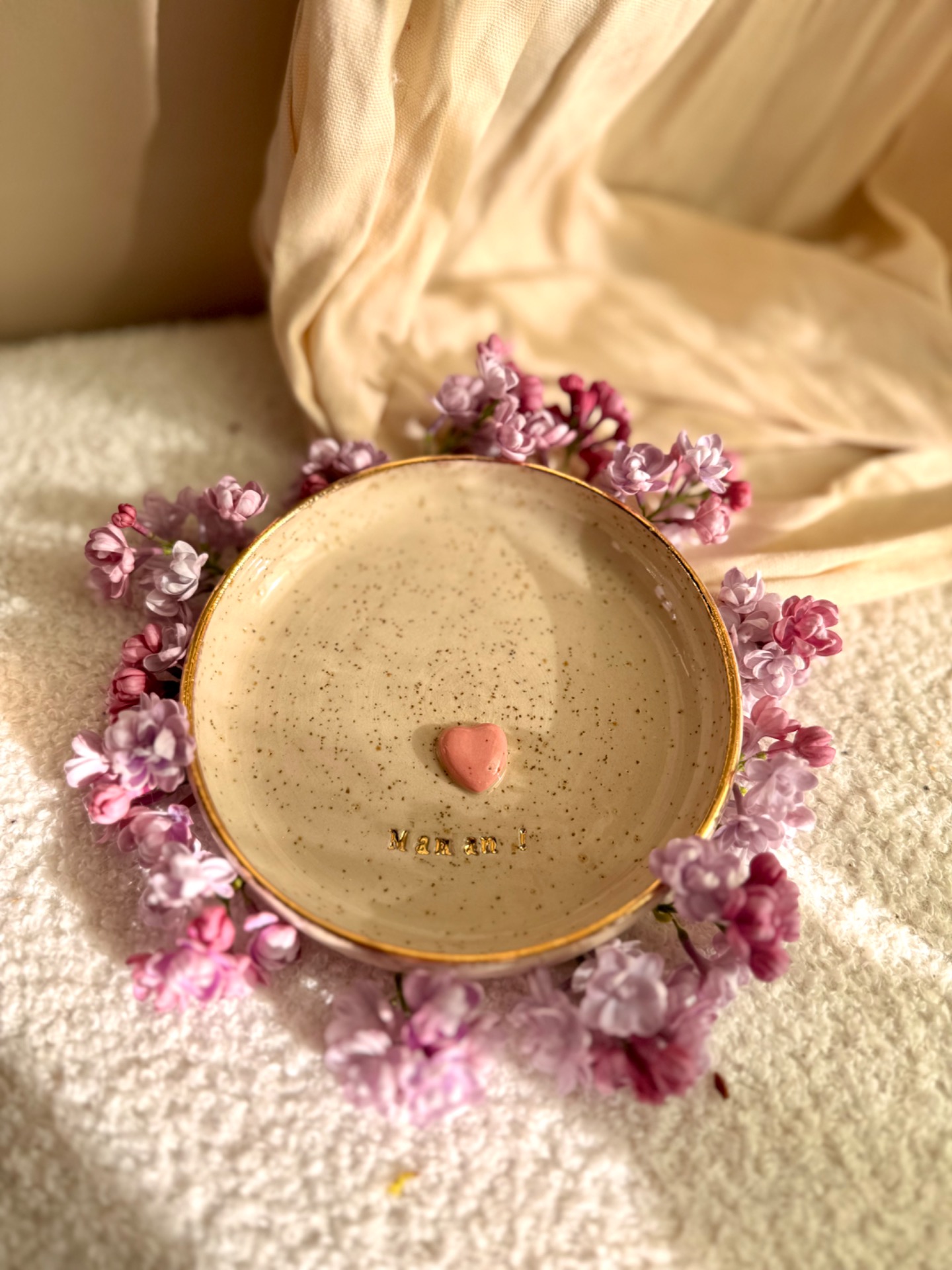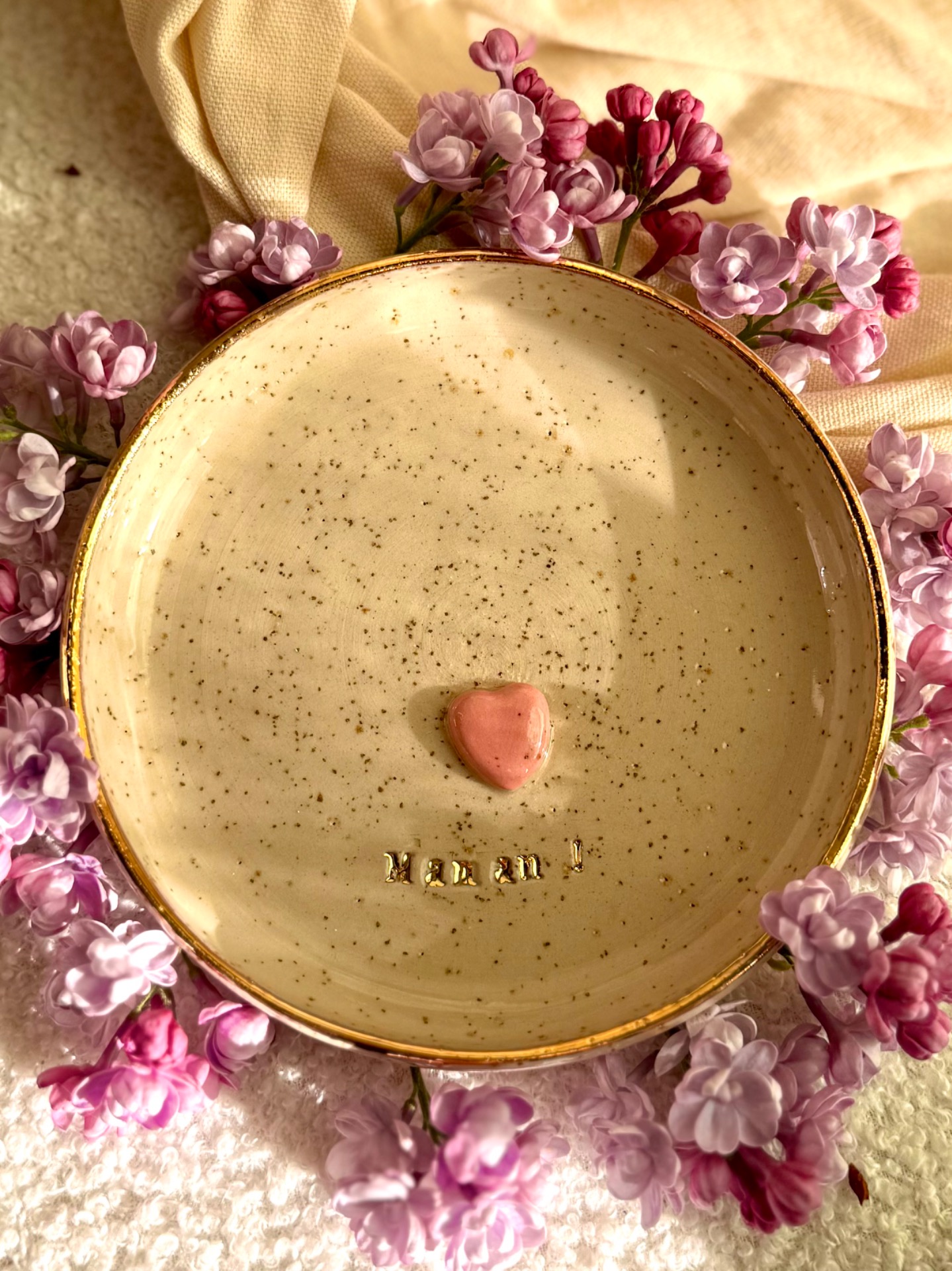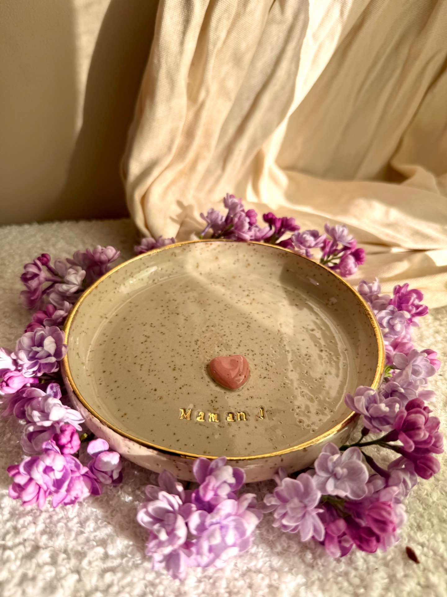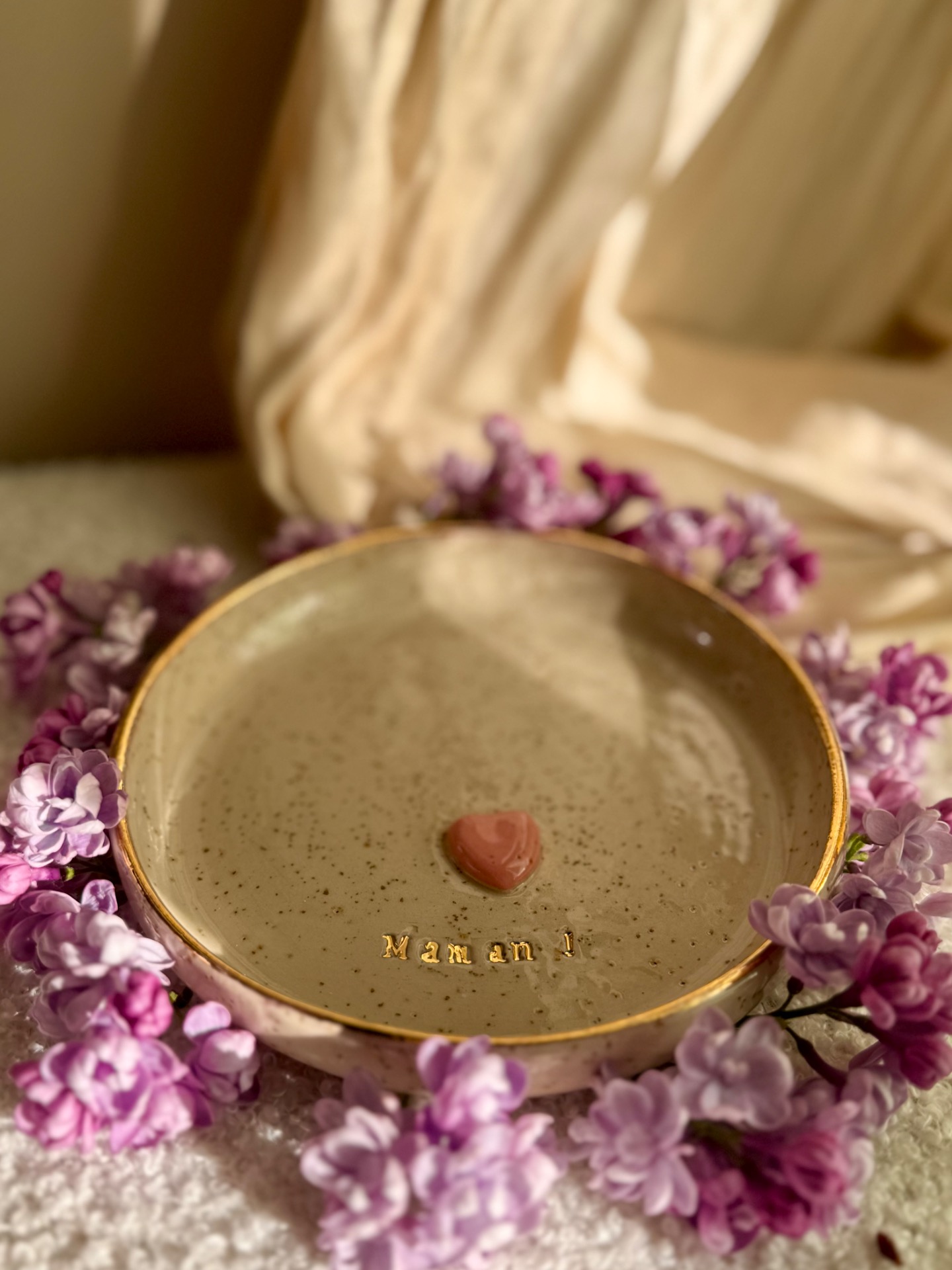 Coupelle « maman » inscription or et coeur 3D rose.Dimension : +/-12 cm de diamètre.