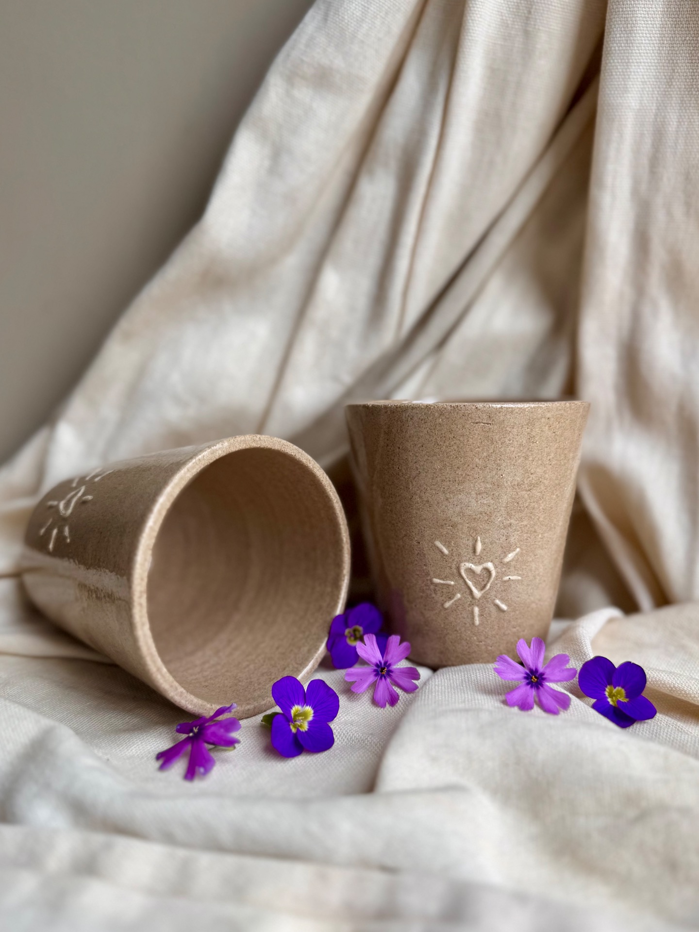 Gobelet terre brune avec decor coeur en 3D plus clair.Email bleu à l’intérieur et transparent.Capacité : +/- 200ml Dilension 8/7cm 1 coeur/tasse