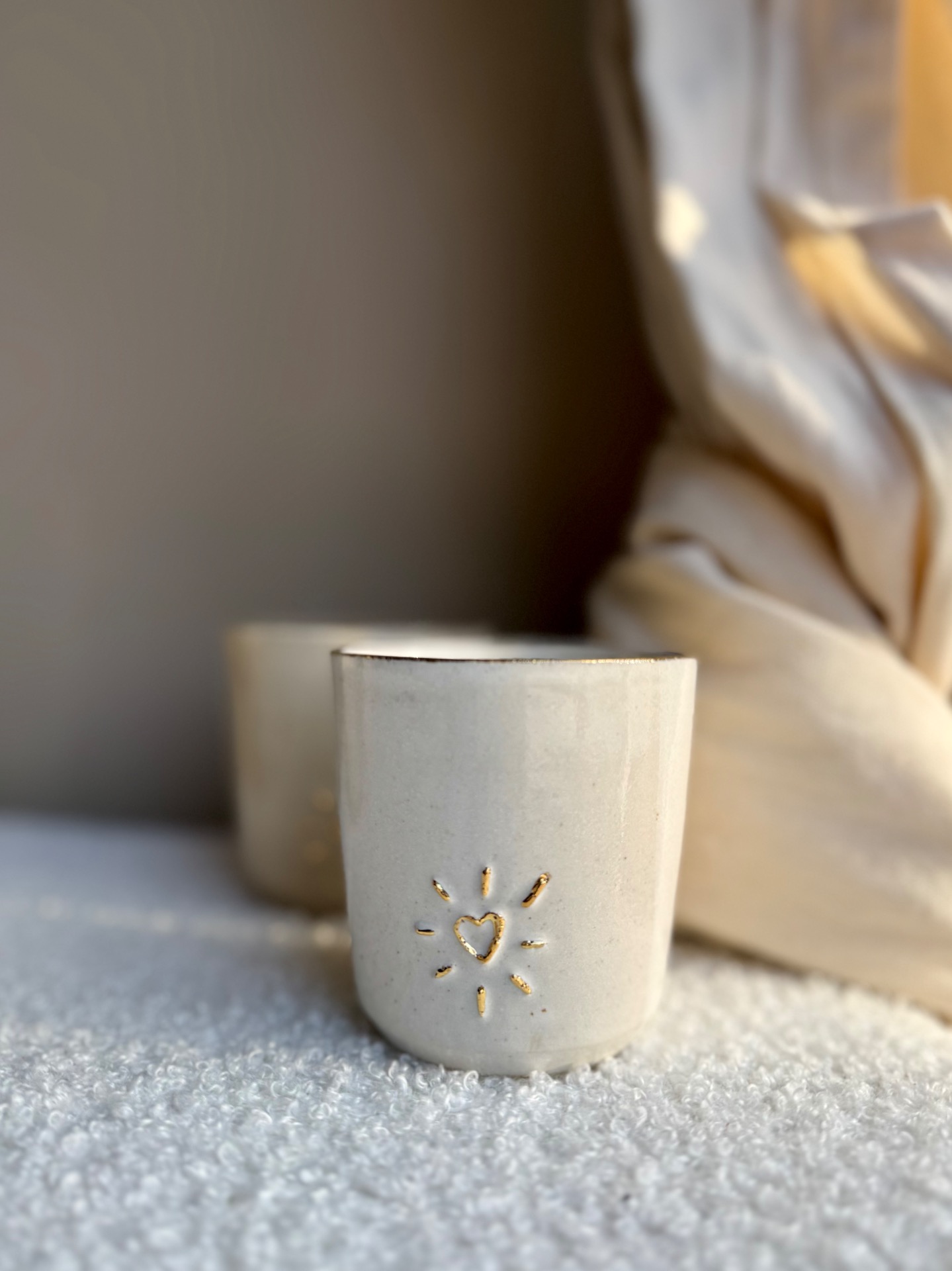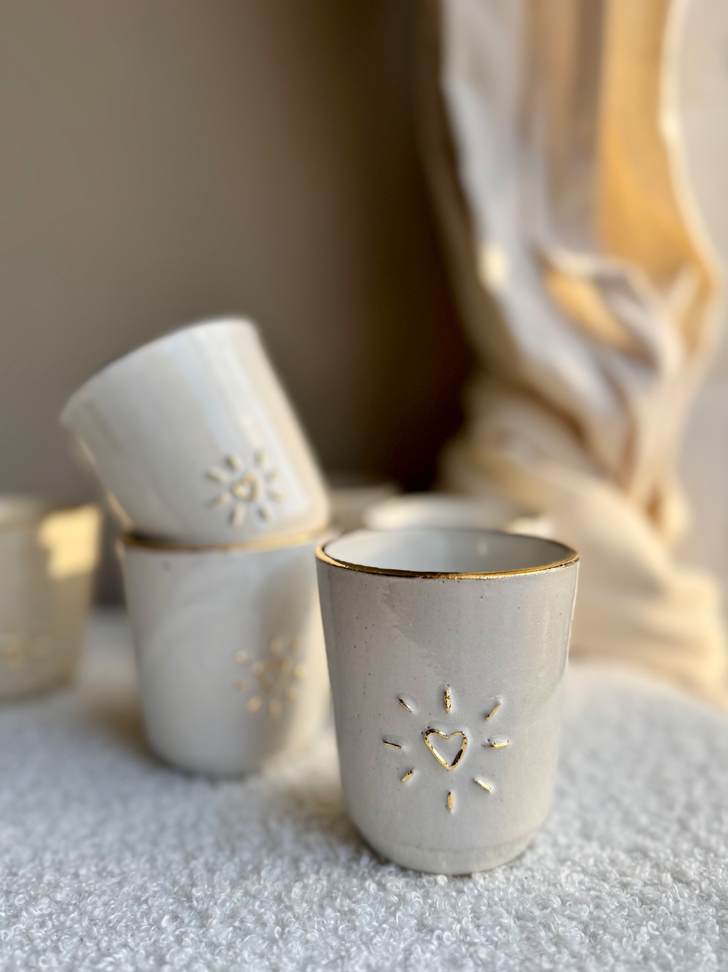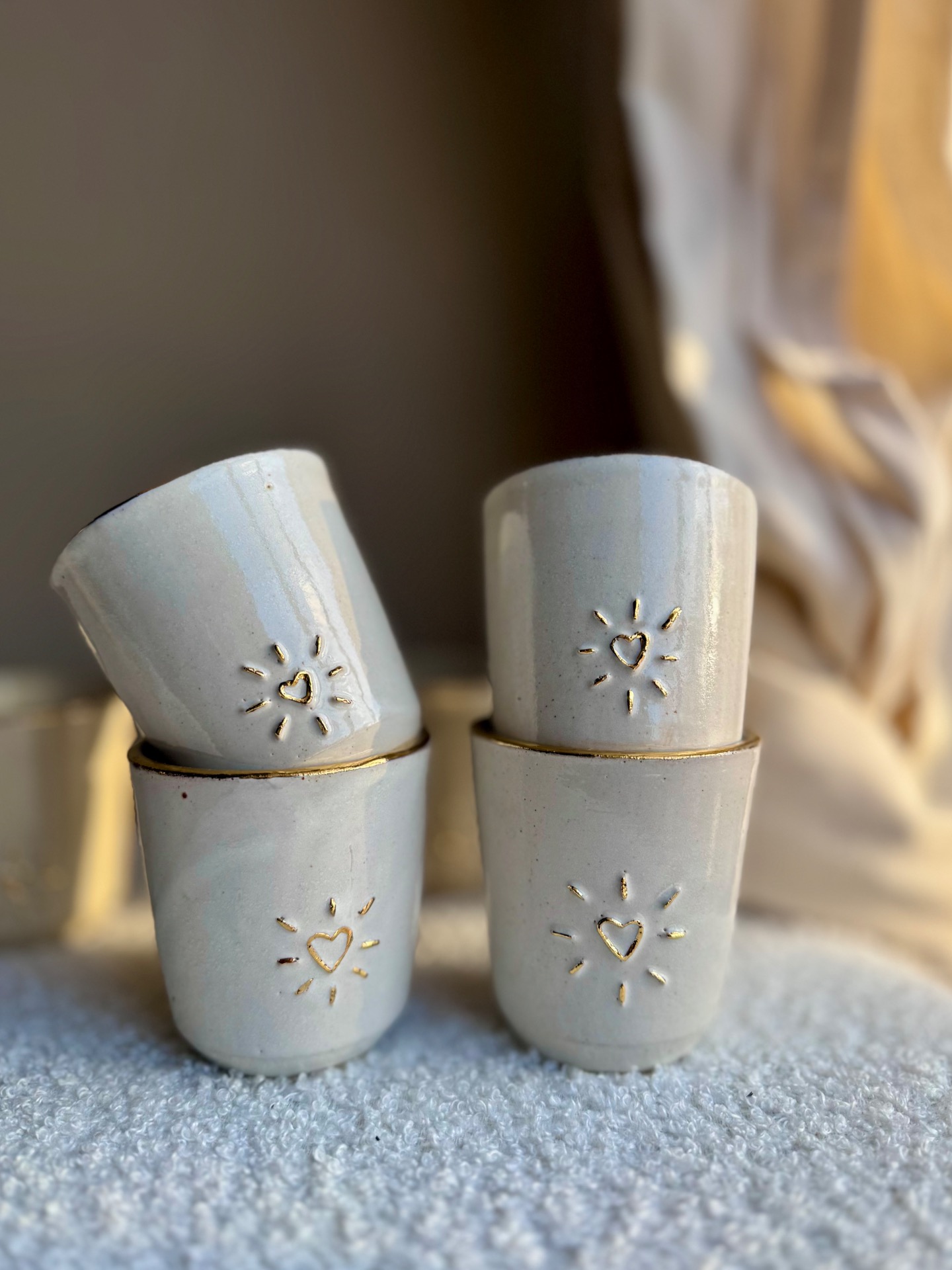 Gobelet avec decor coeur en 3D ligneDécor en or.Email blanc.Capacité : +/- 200ml Dilension 8/7cm