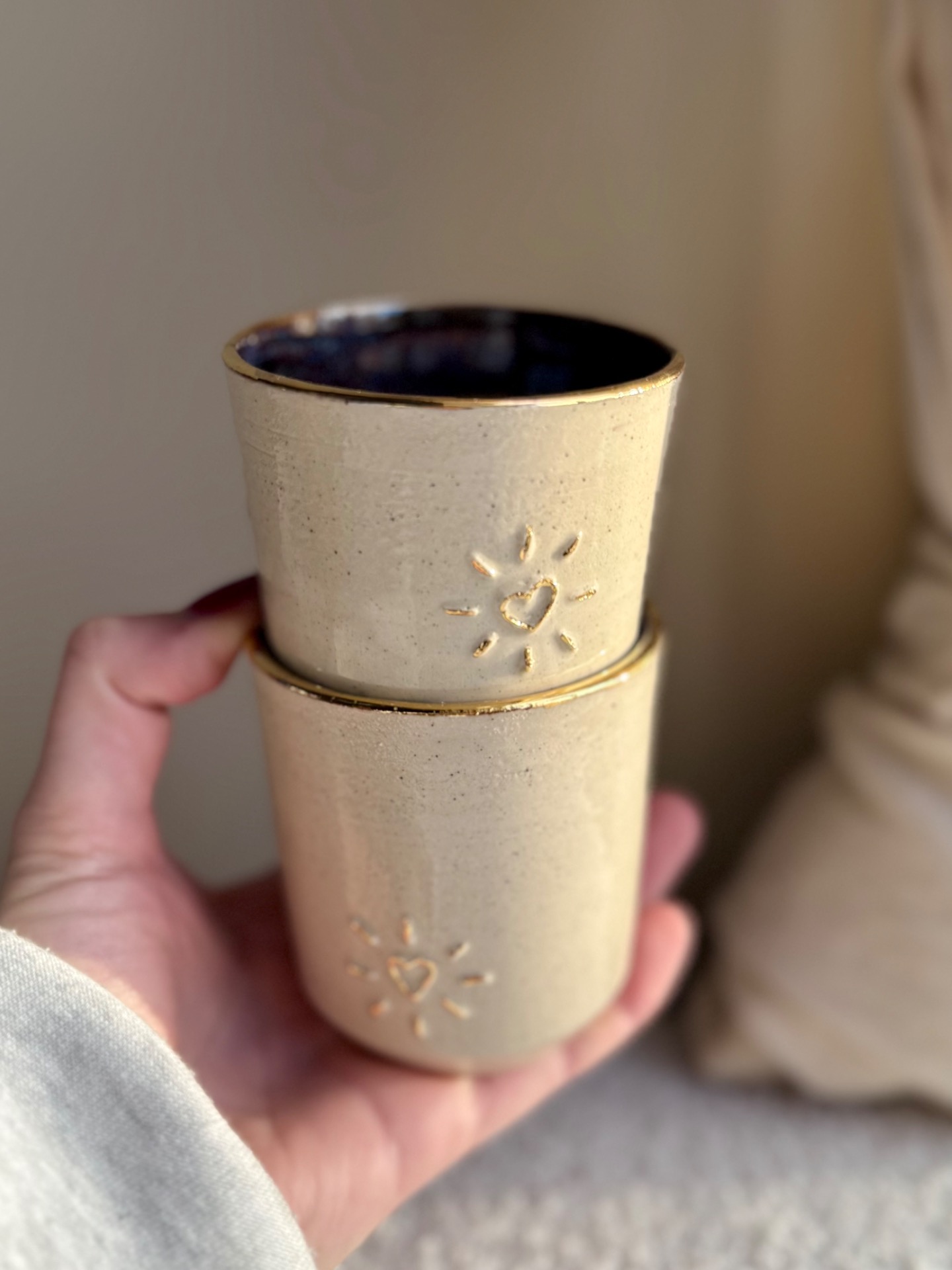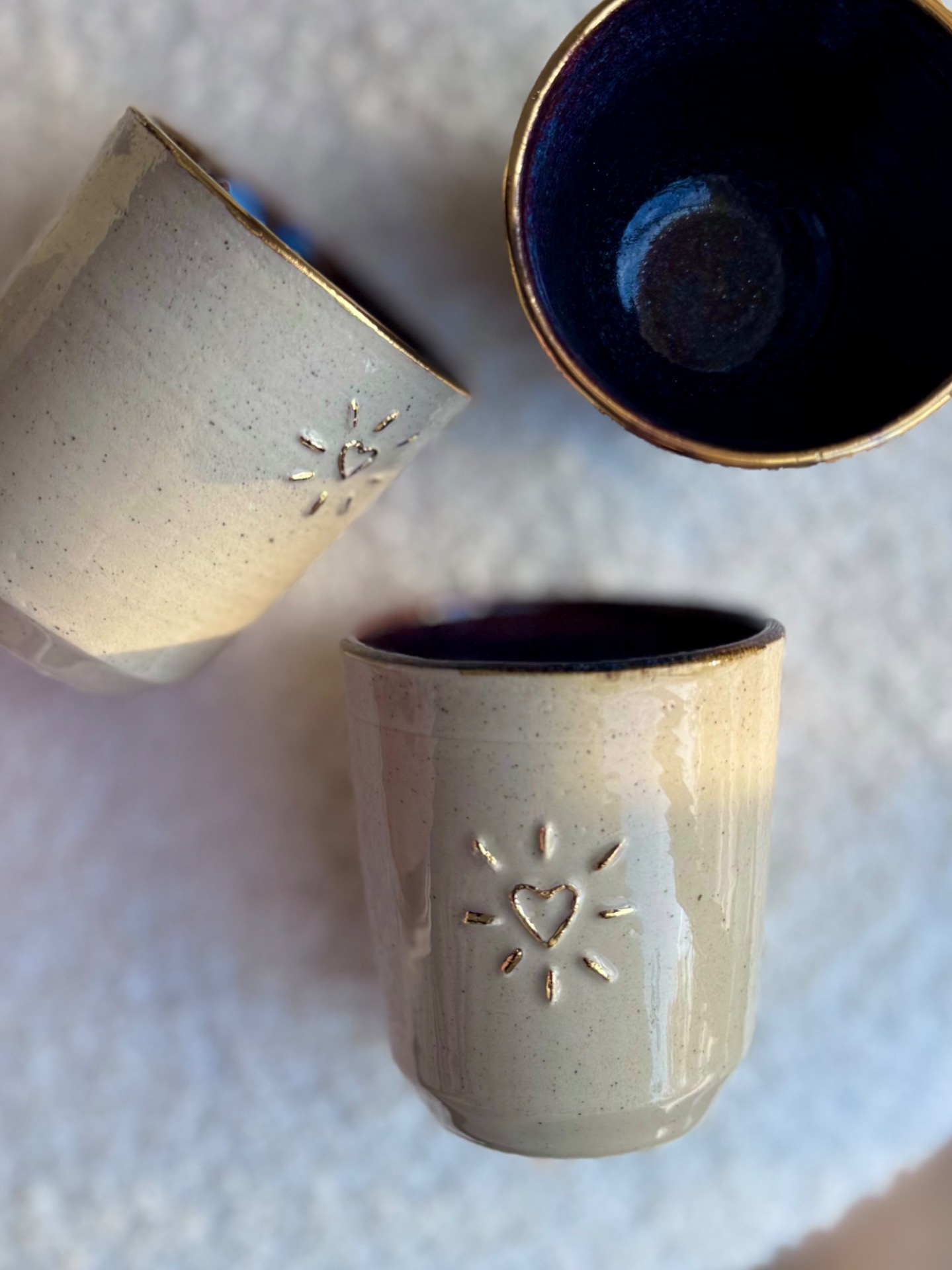 Gobelet terre blanche avec decor coeur en 3D ligneDécor et liseré en or.Email bleu et transparent.Capacité : +/- 200ml Dilension 8/7cm
