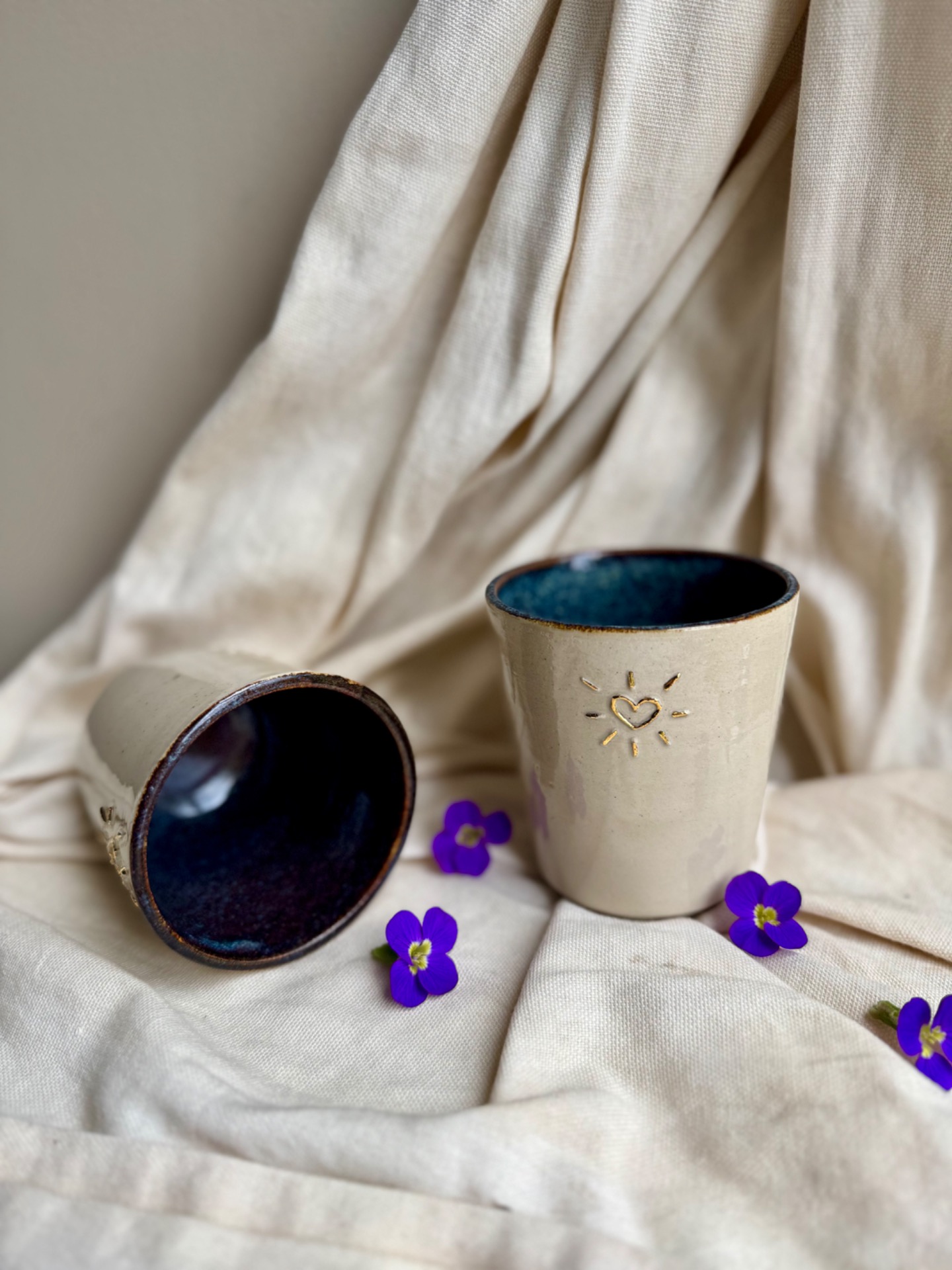 Gobelet terre blanche avec decor coeur en 3D ligneDécor en or. SANS liseré.Email bleu et transparent.Capacité : +/- 200ml Dilension 8/7cm