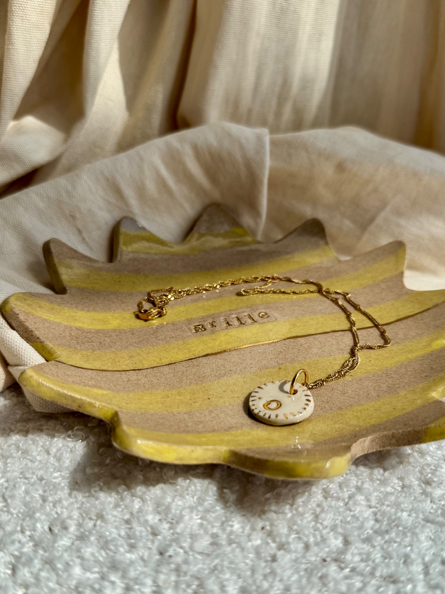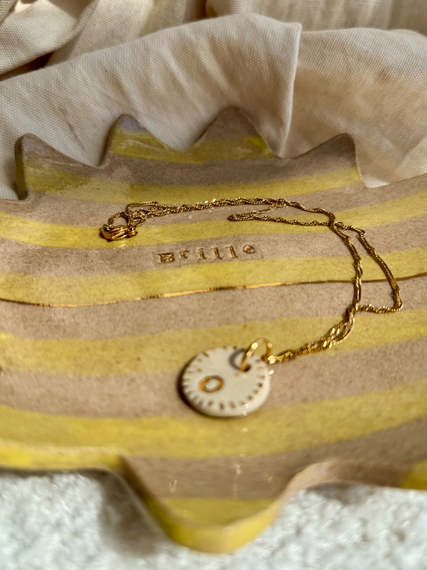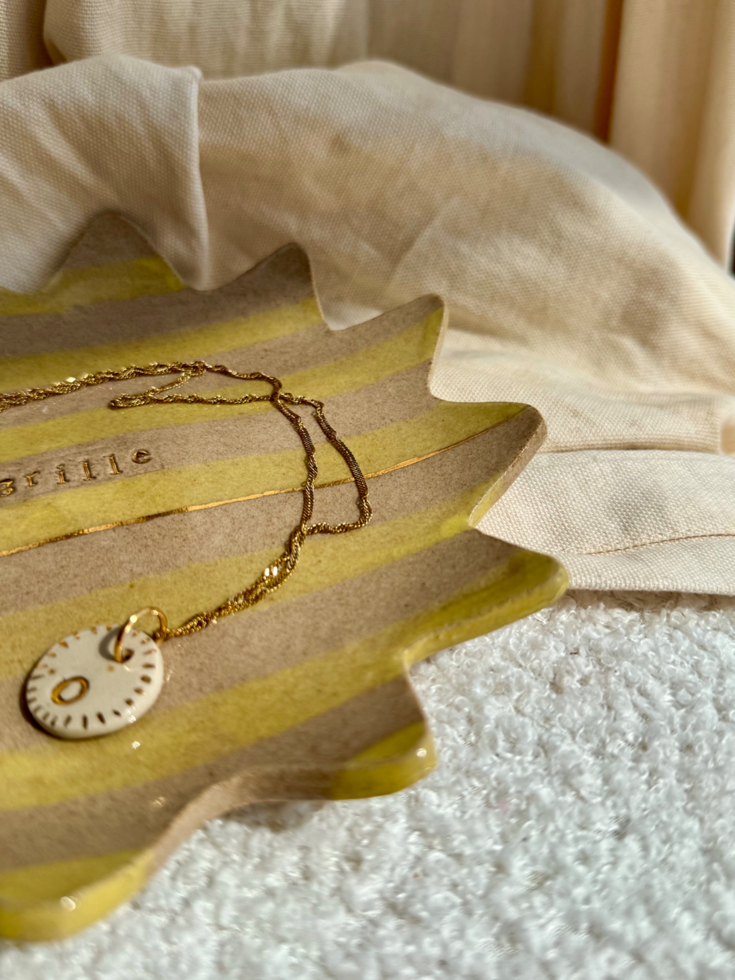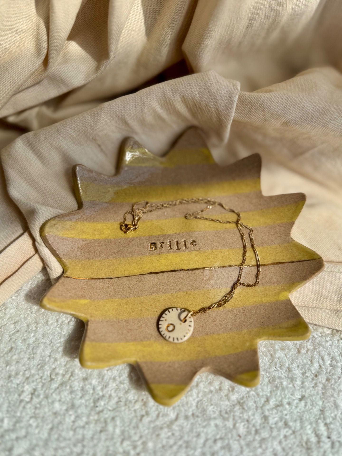 Grande coupelle en forme de soleil. emaillage jaune et transparent.Inscription « Brille » en or.Dimension : 20 cm de diamètre.