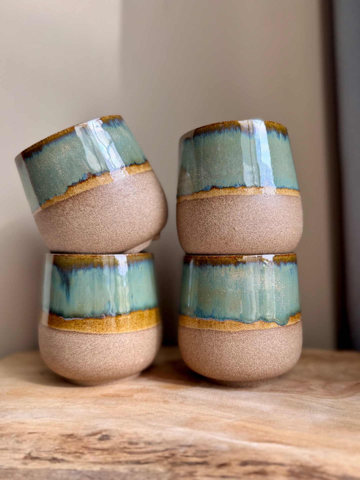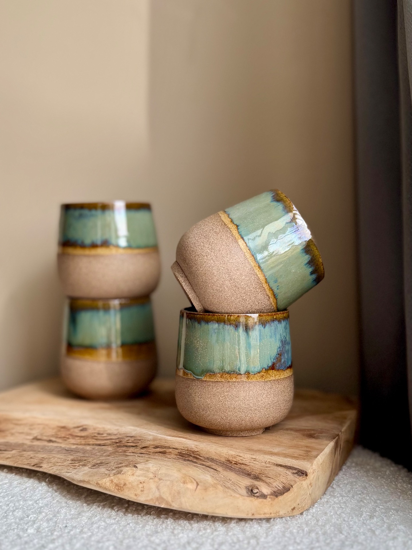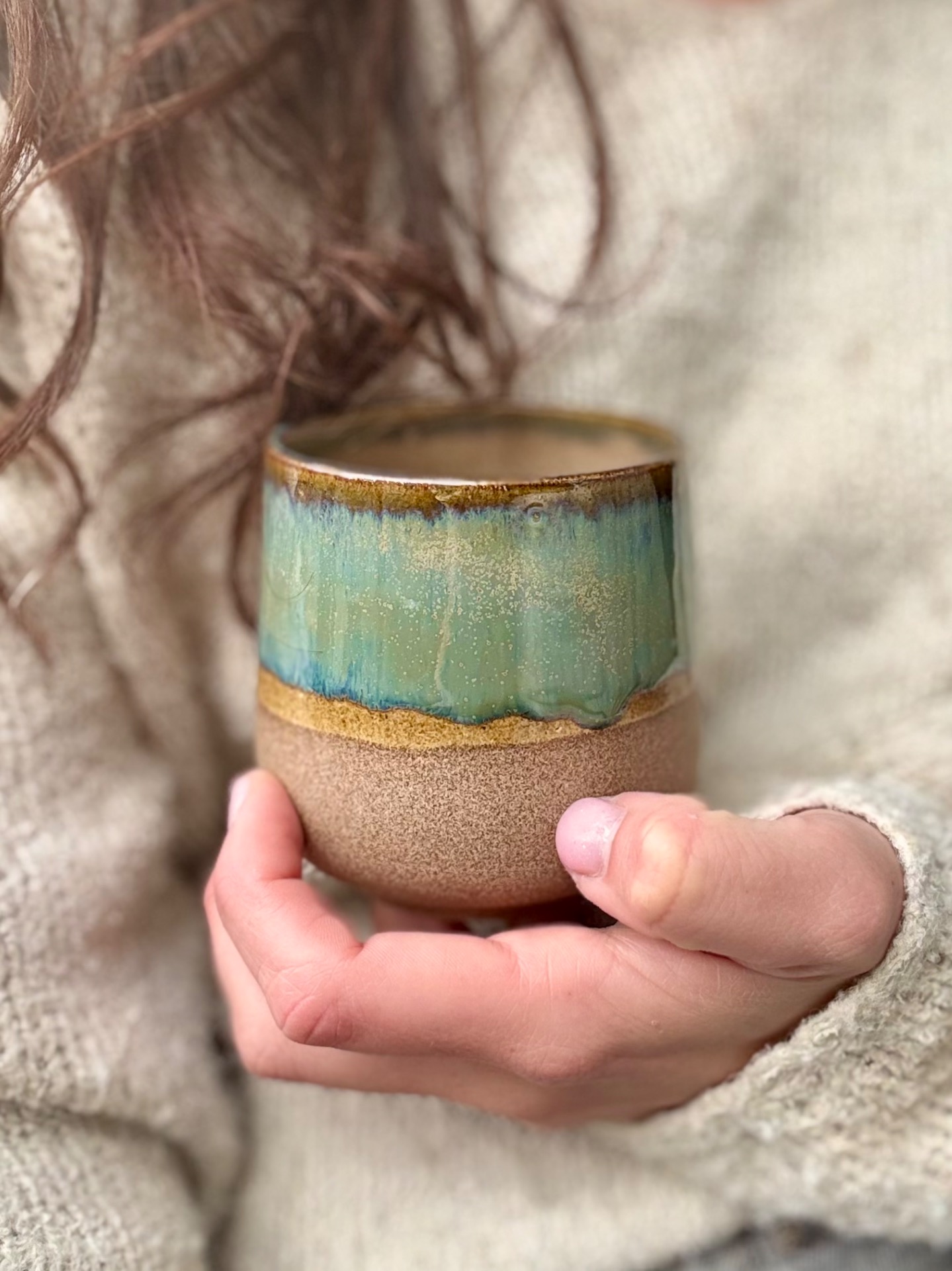 Tasse sans anse terre brune apparente avec emaillage vert/bleuCapacite : 300mlDimension : 10/8cm