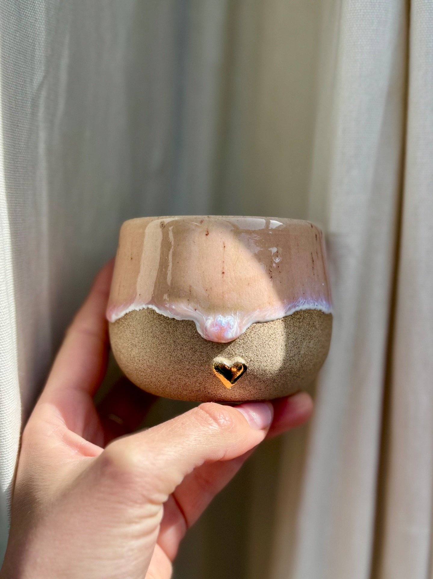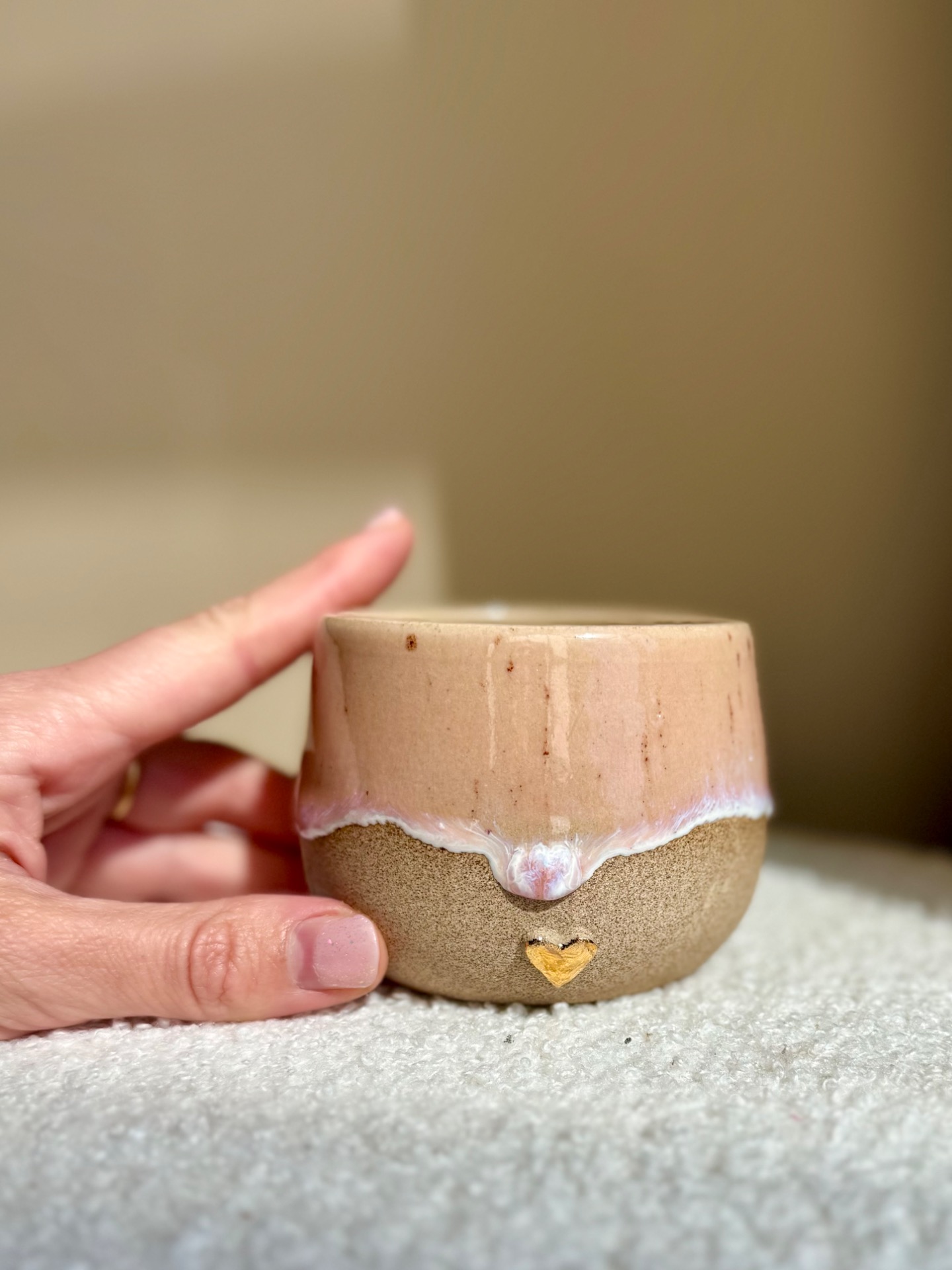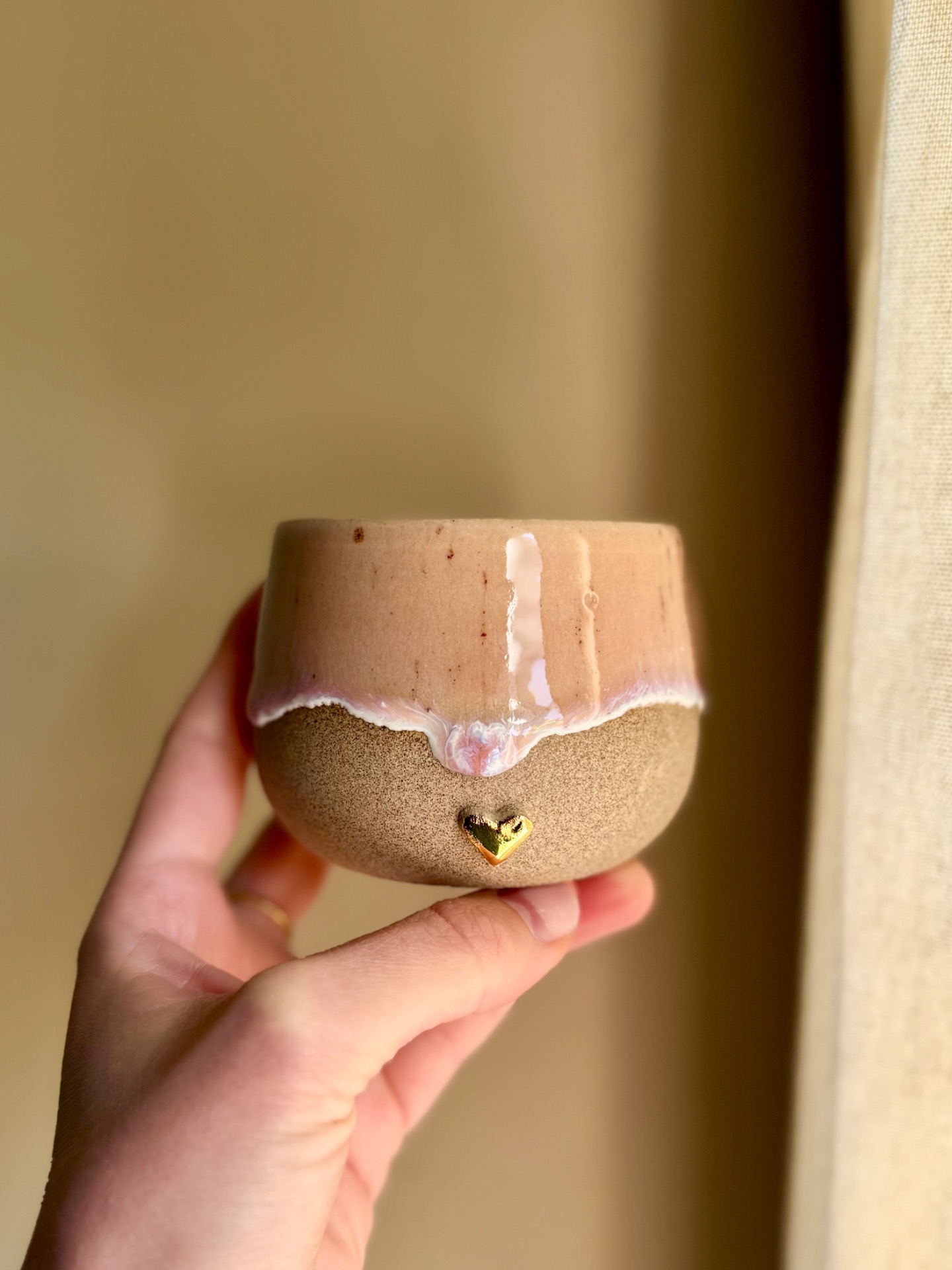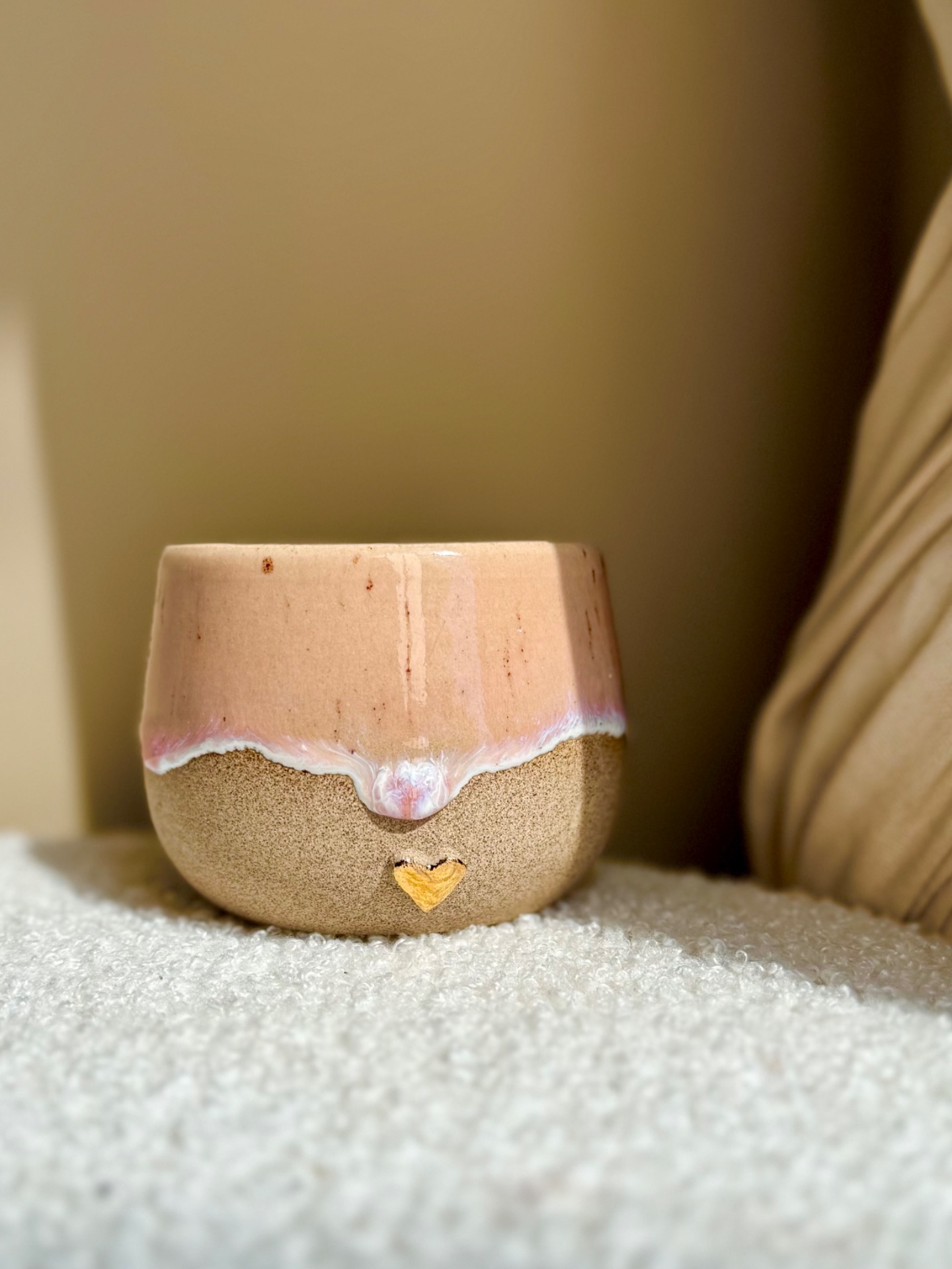 Tasse ronde terre naturelle émaillée rose avec coeur 3D or brillant.