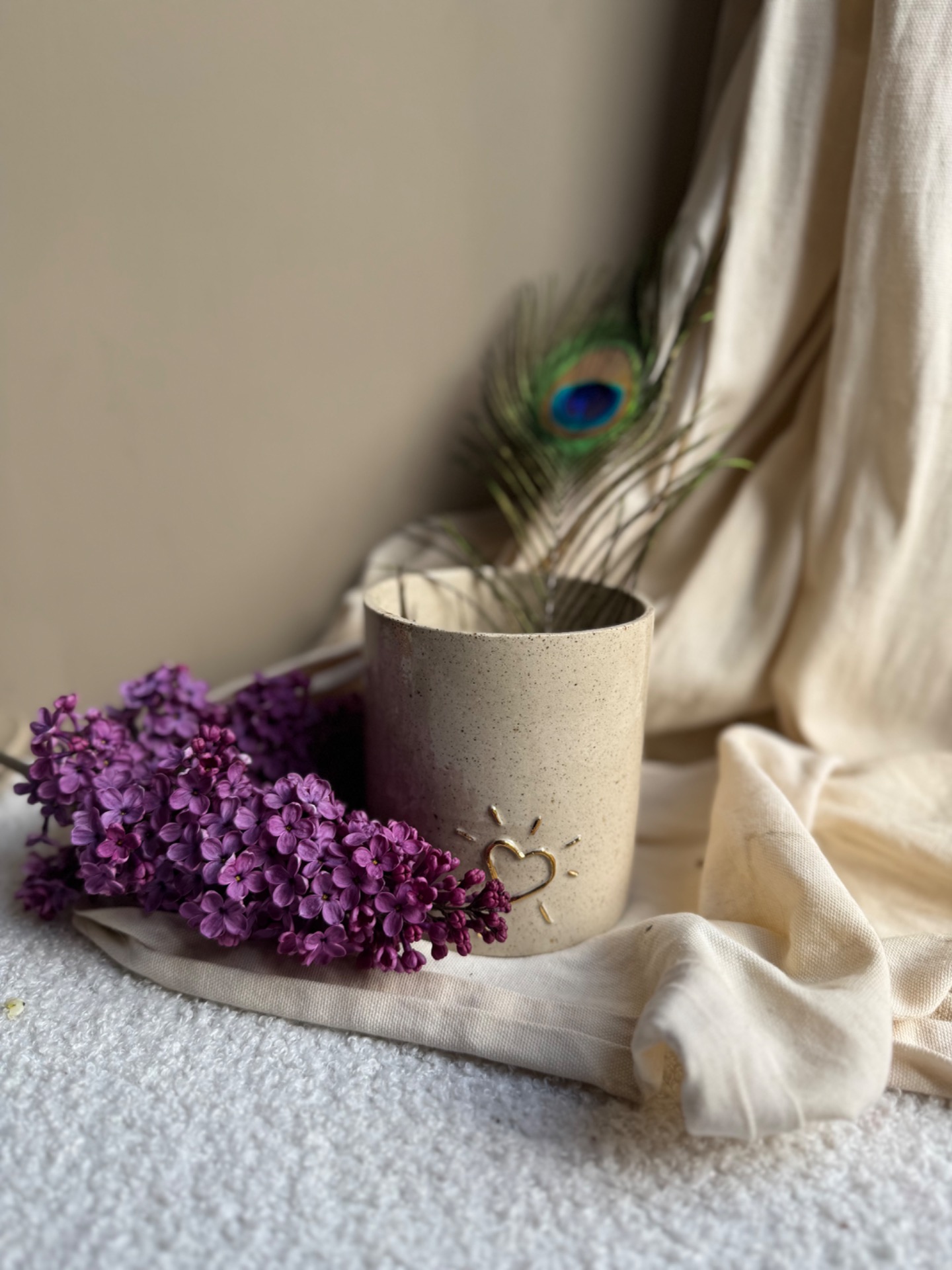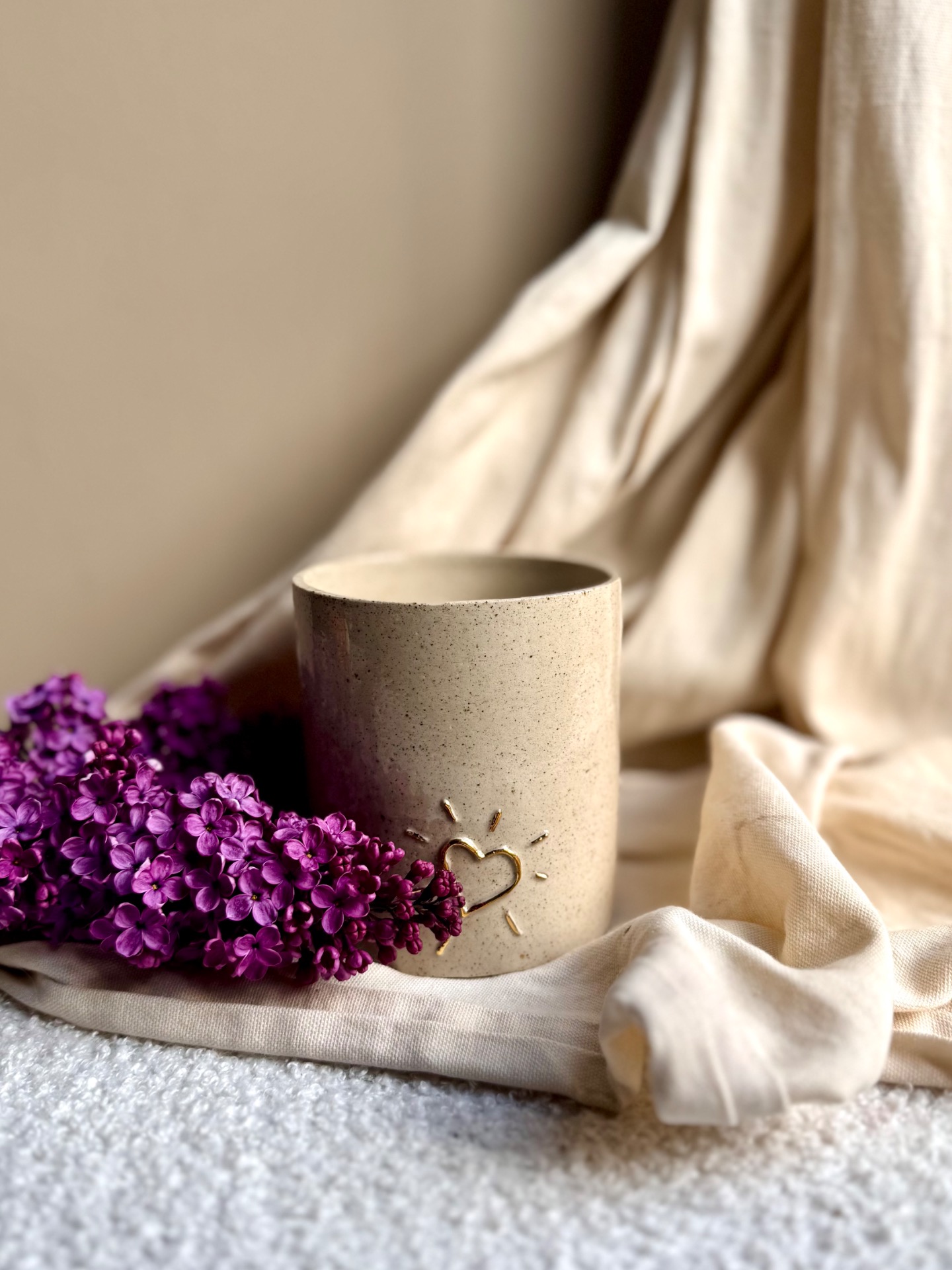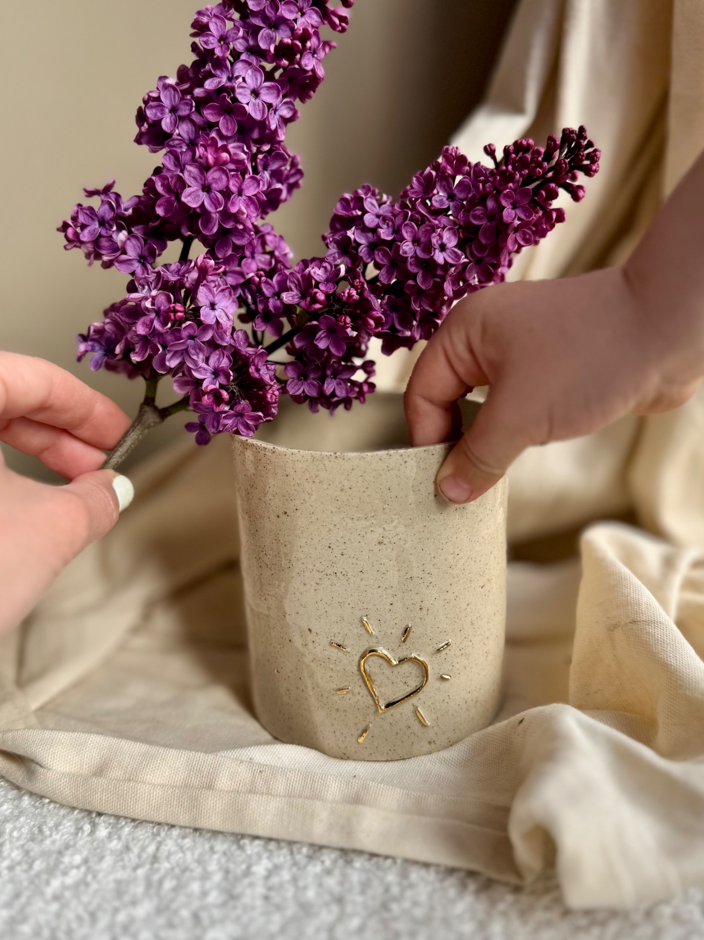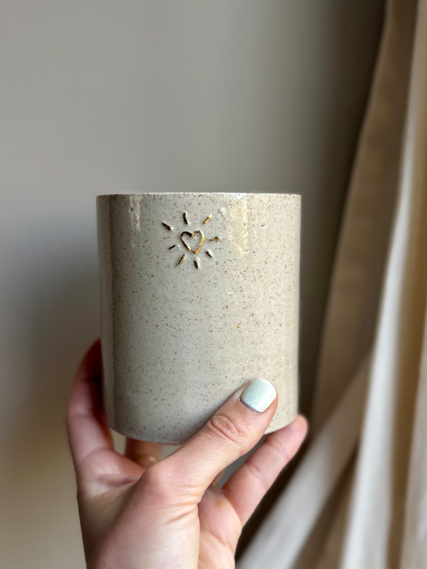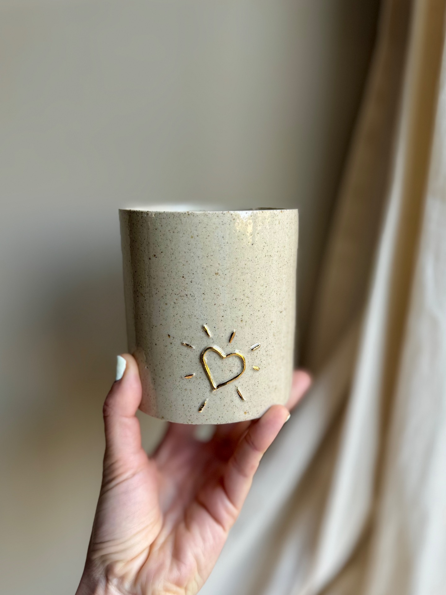 Pot multifonction (cache pot, pot a bic, petit vase,…) terre pyritee et 2 coeurs 2D en or.