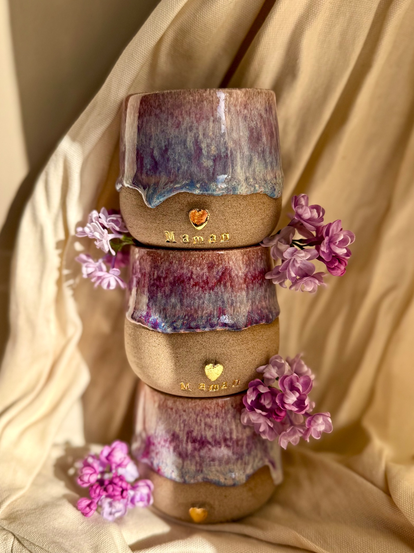 Tasse terre pyritee apparente et emaillage 3 feux.coeur or et inscription « maman » orDimension : 8/8 cm