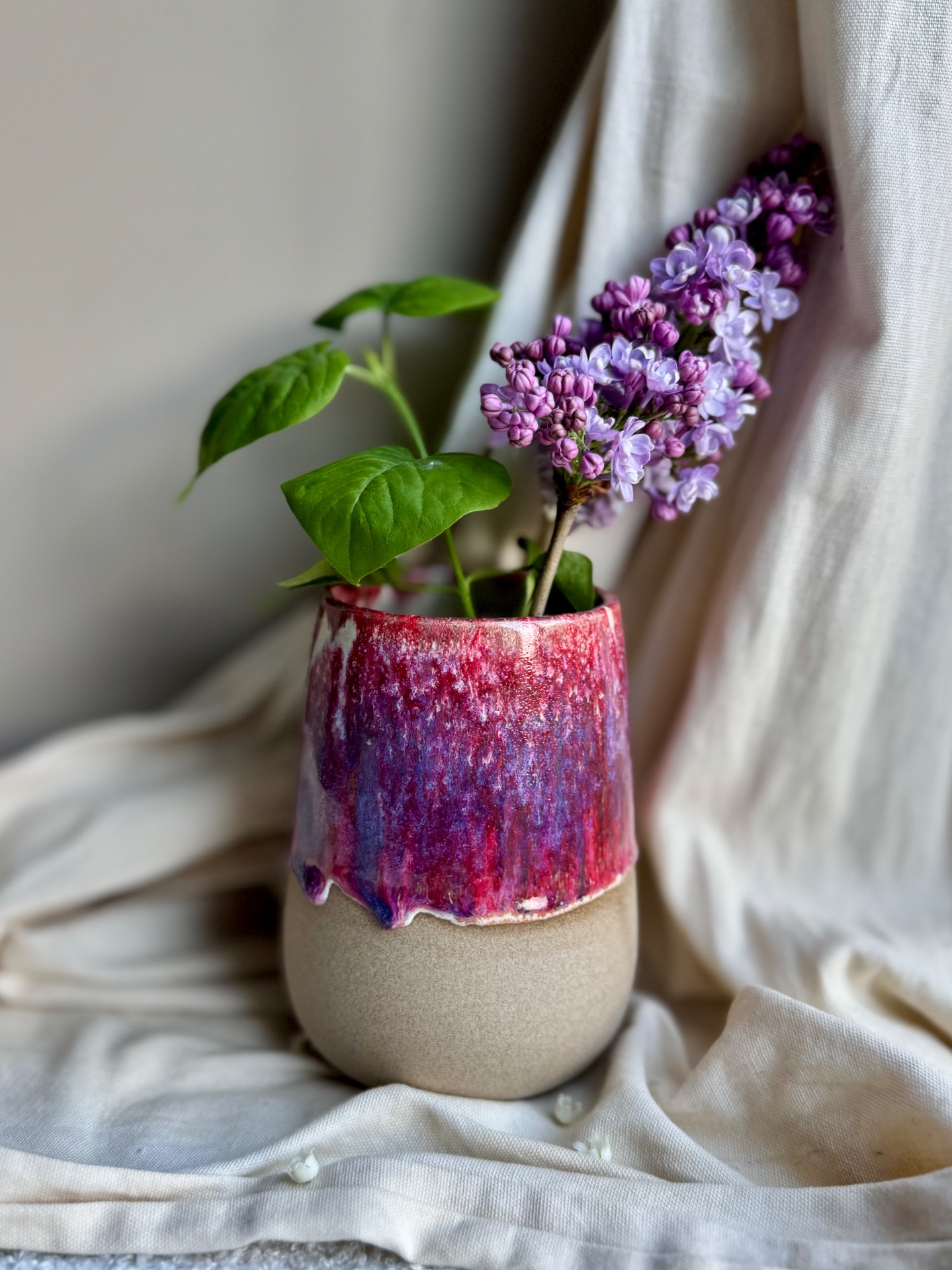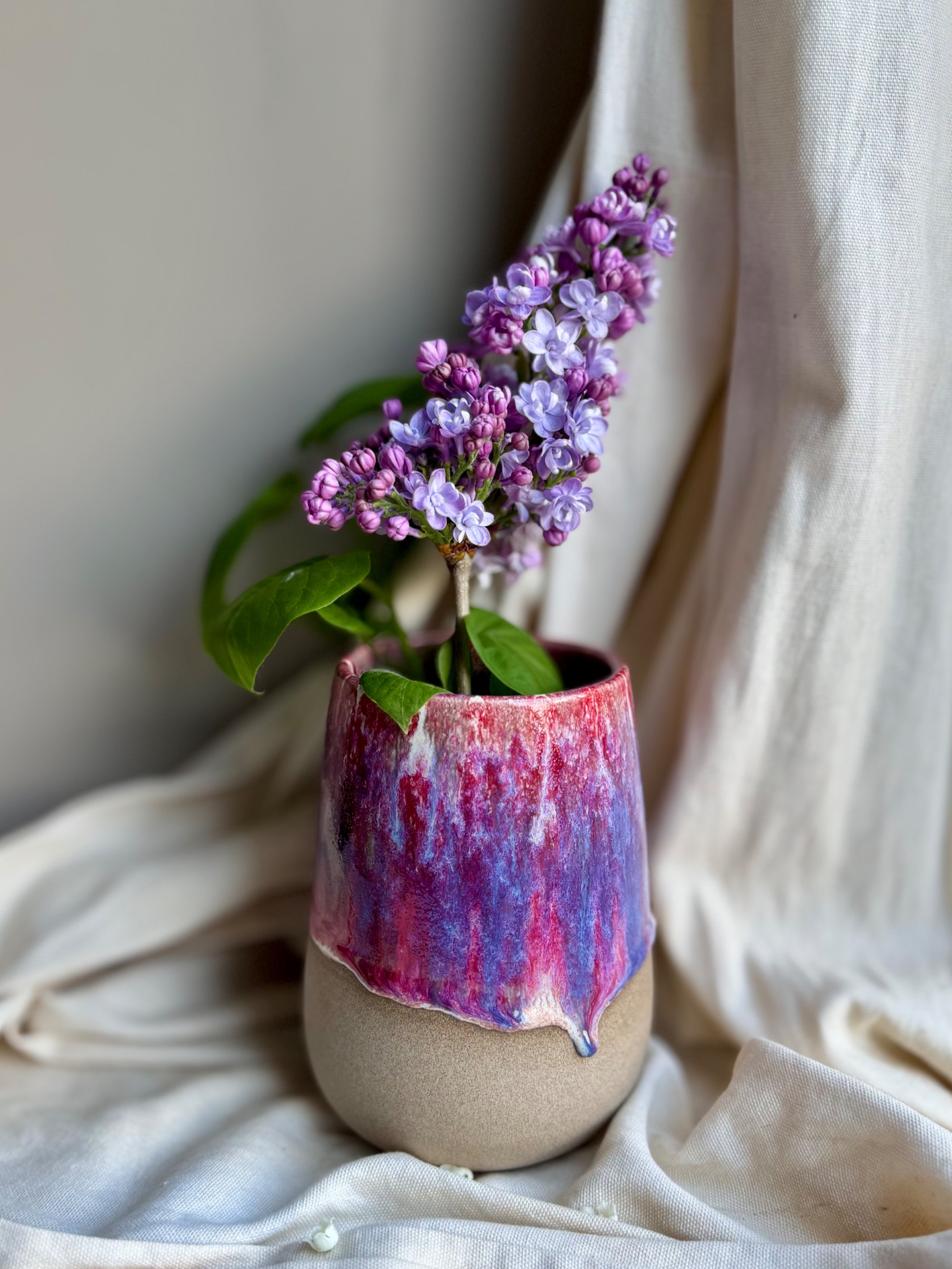Petit vase rose mauve email coulant, terre apparente.